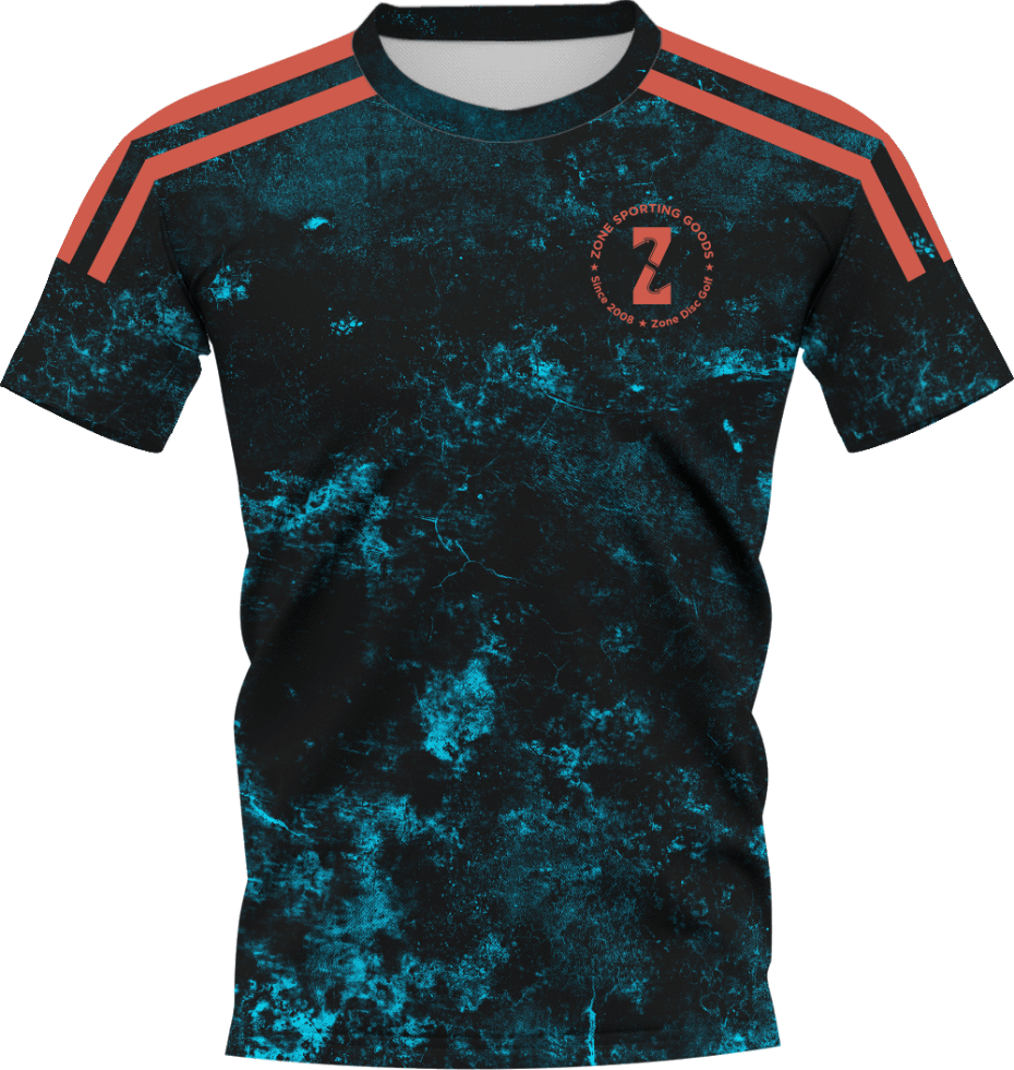 Disc golf jersey designed by Andrew Klein. Produced and delivered by Zone Sporting Goods.