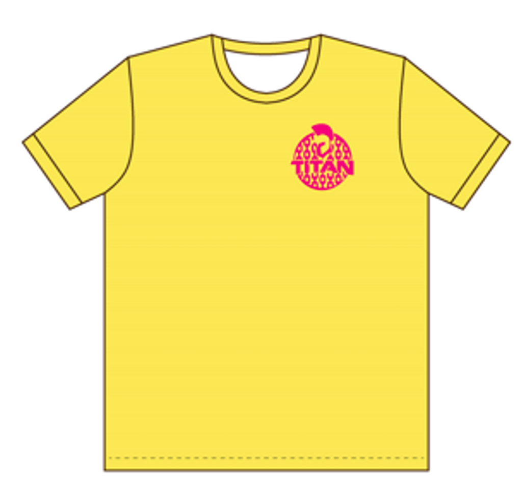 A yellow disc golf jersey with an illustration of a stylized, cartoonish character and a sunset background, designed by Scott Stokely.Custom disc golf jerseys built for performance and style. Free team mockups available.