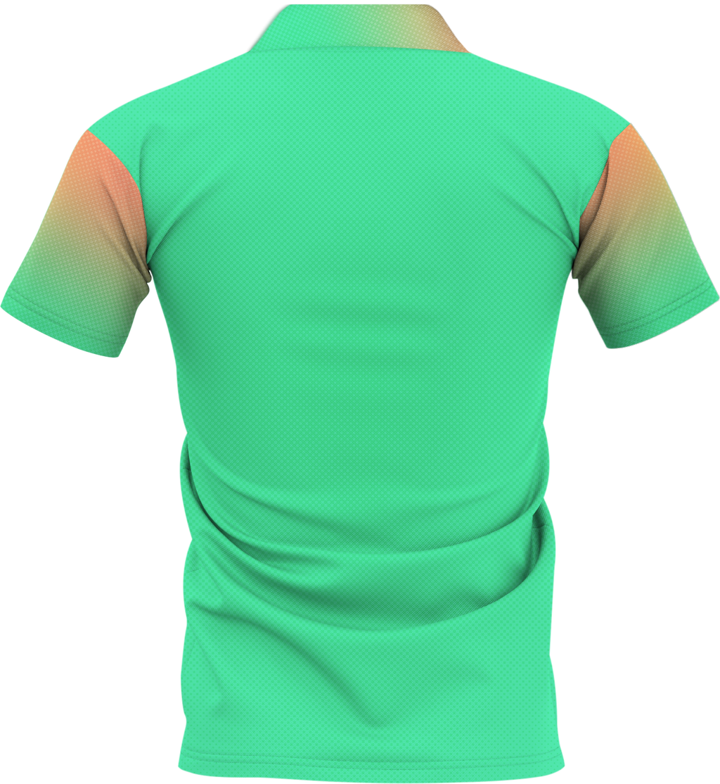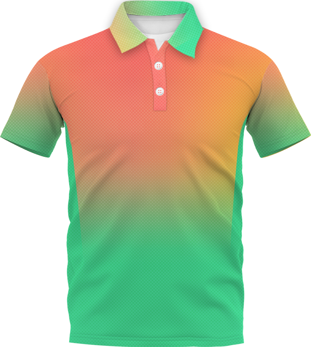 A yellow disc golf jersey with an illustration of a stylized, cartoonish character and a sunset background, designed by Scott Stokely.Custom disc golf jerseys built for performance and style. Free team mockups available.