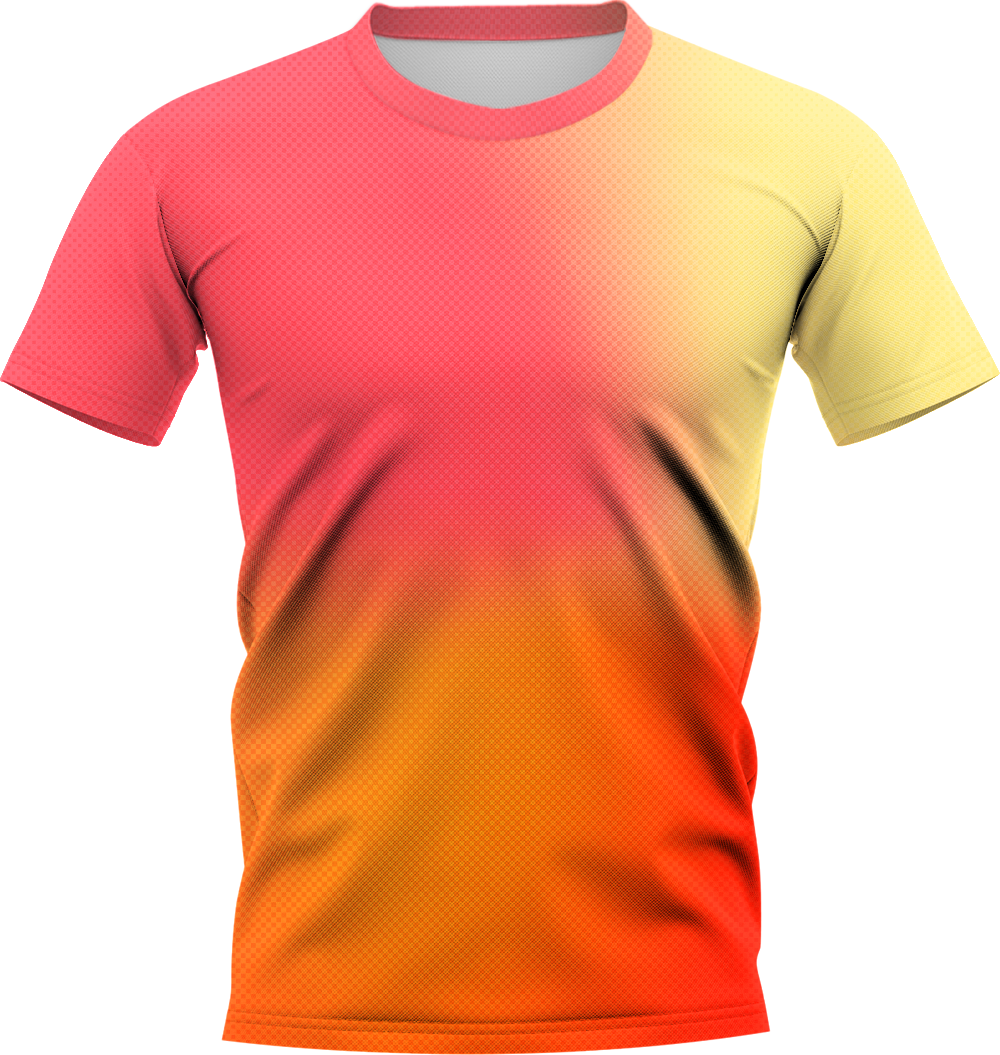 A yellow disc golf jersey with an illustration of a stylized, cartoonish character and a sunset background, designed by Scott Stokely.Custom disc golf jerseys built for performance and style. Free team mockups available.
